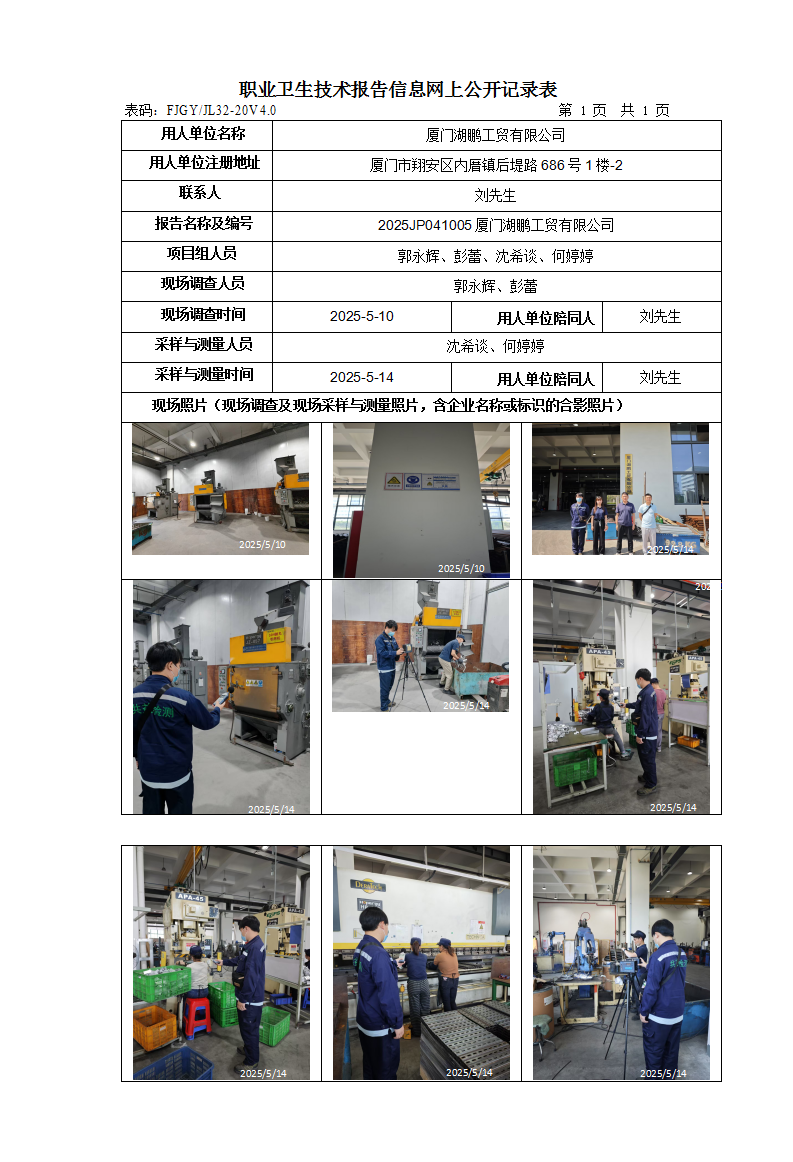 厦门湖鹏工贸有限公司-2025年工作场所职业病危害因素检测