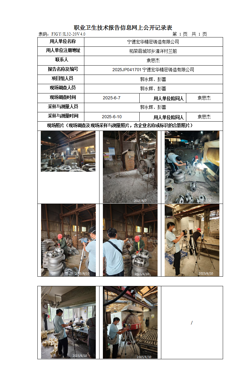 宁德宏华精密铸造有限公司-2025年工作场所职业病危害因素检测