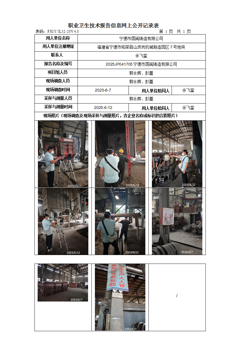 宁德市国闽铸造有限公司-2025年工作场所职业病危害因素检测
