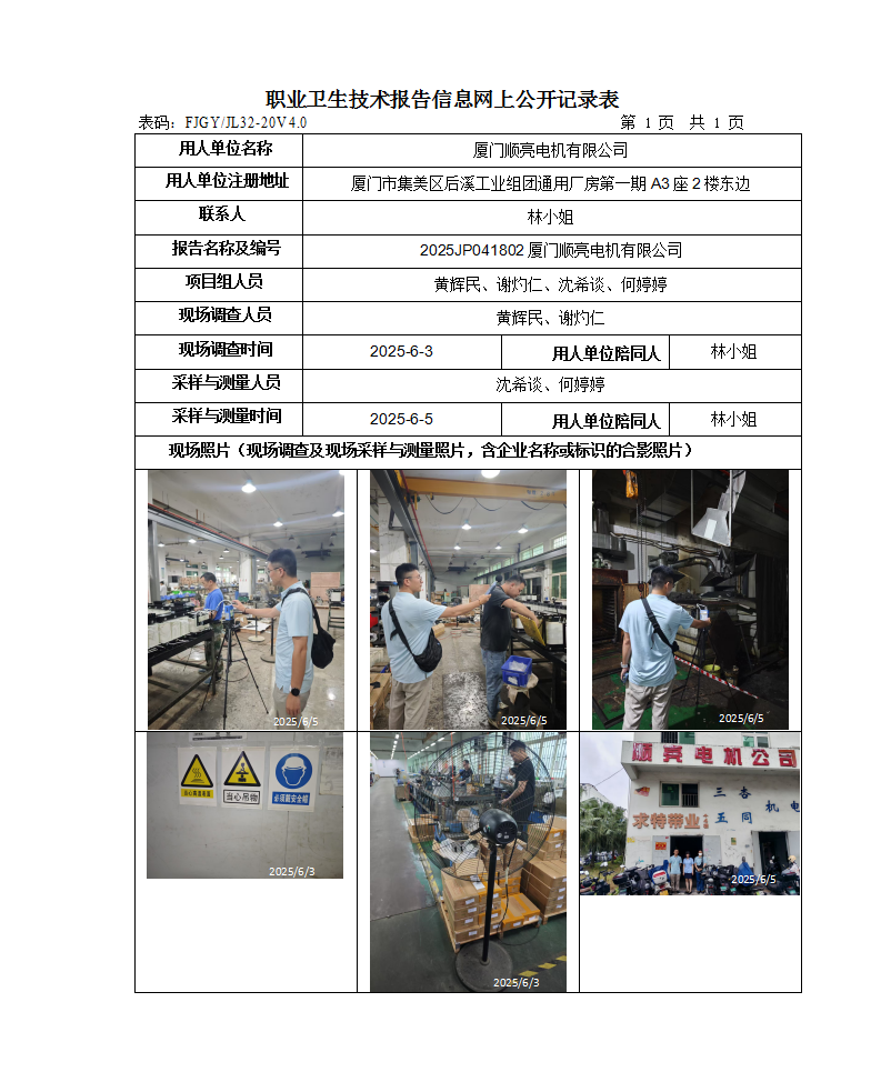 厦门顺亮电机有限公司-2025年工作场所职业病危害因素检测