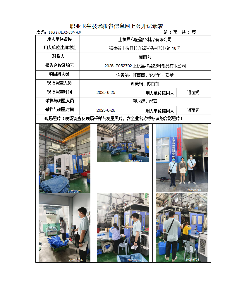 上杭县和盛塑料制品有限公司-2025年工作场所职业病危害因素检测