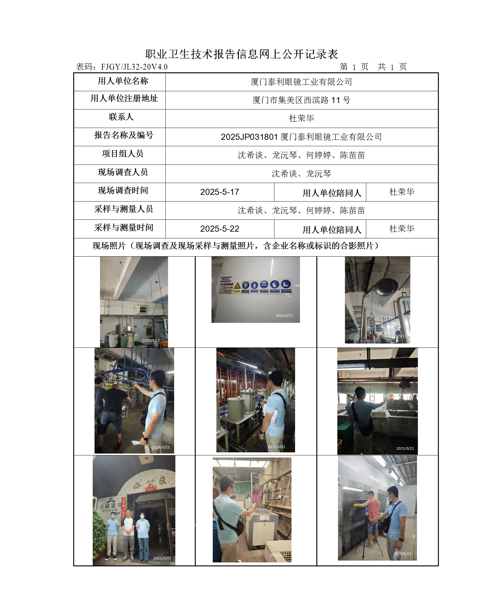 厦门泰利眼镜工业有限公司-2025年工作场所职业病危害因素检测