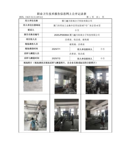 厦门鑫万彩高分子科技有限公司-2025年工作场所职业病危害因素检测