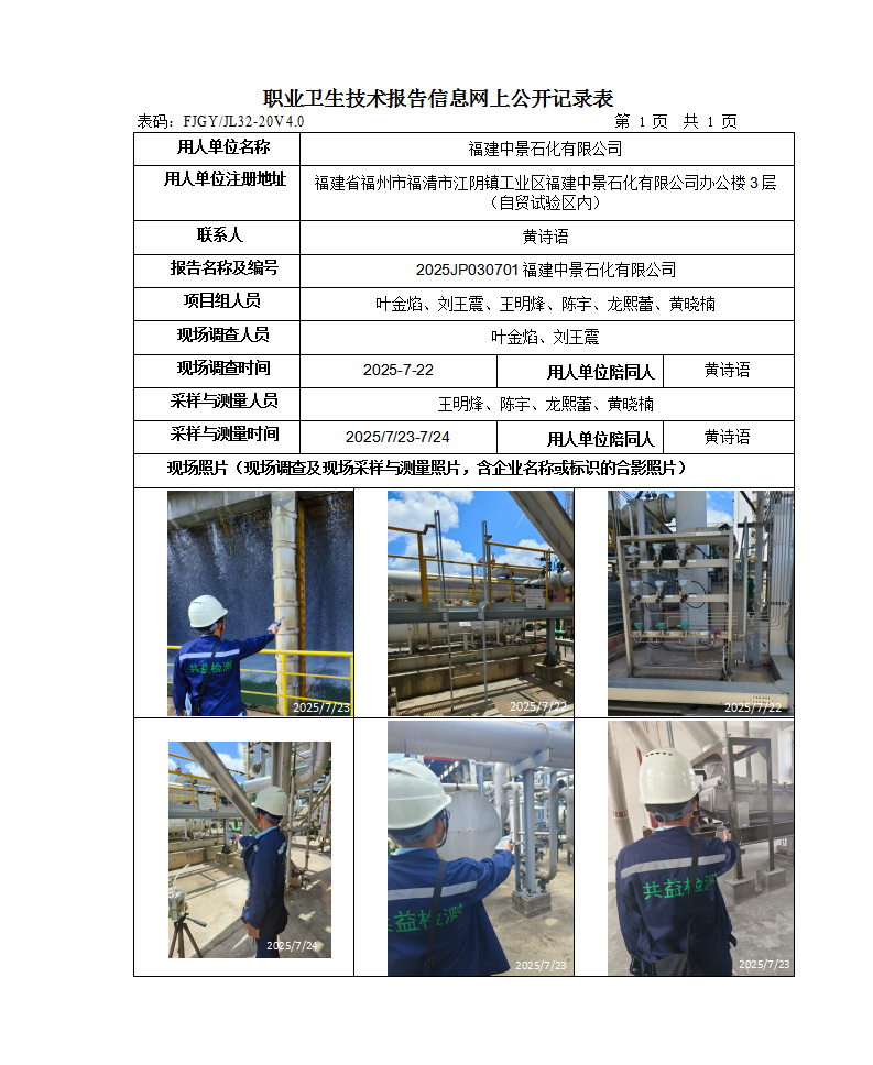 福建中景石化有限公司-2025年工作场所职业病危害因素检测
