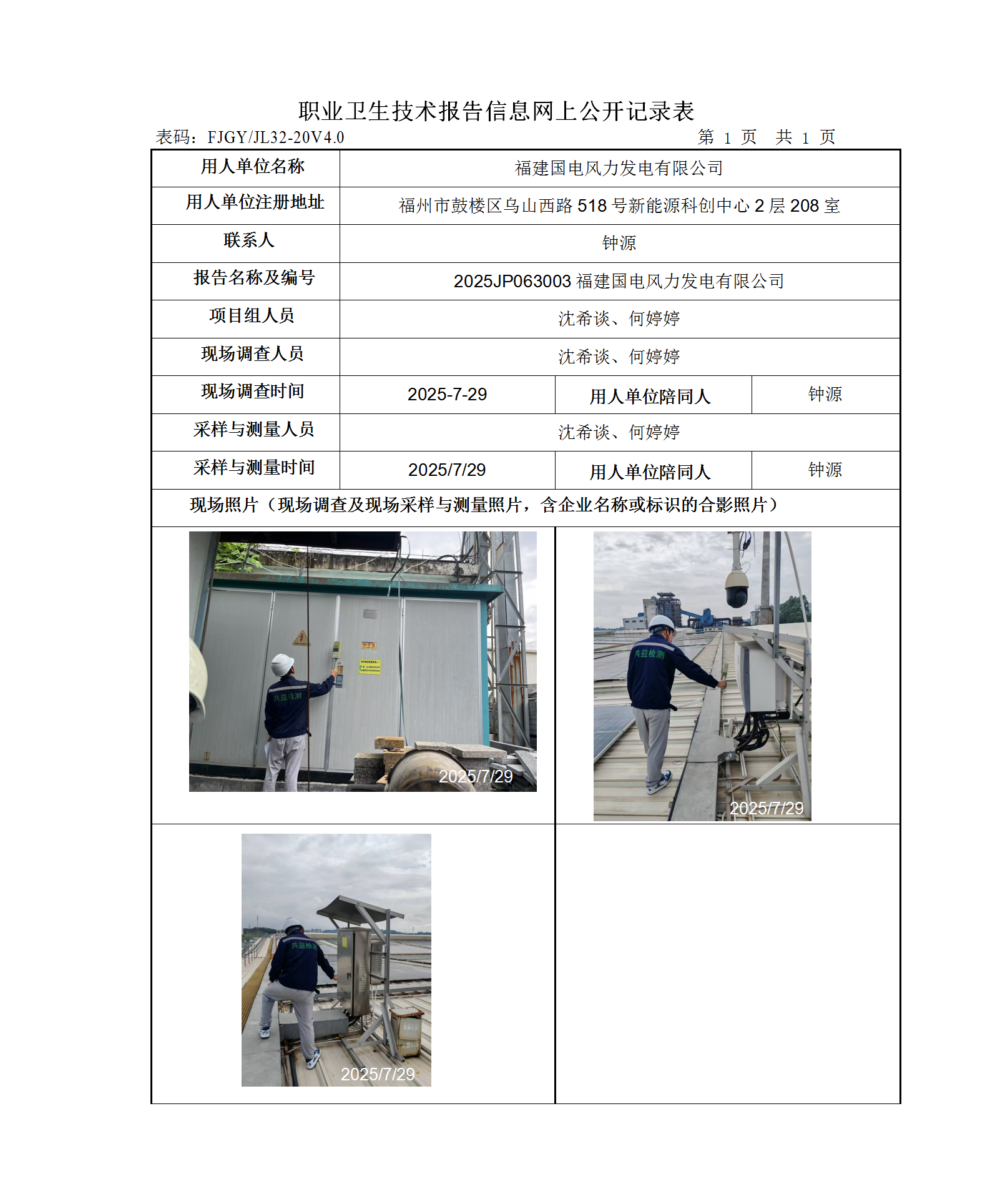 福建国电风力发电有限公司-2025年工作场所职业病危害因素检测
