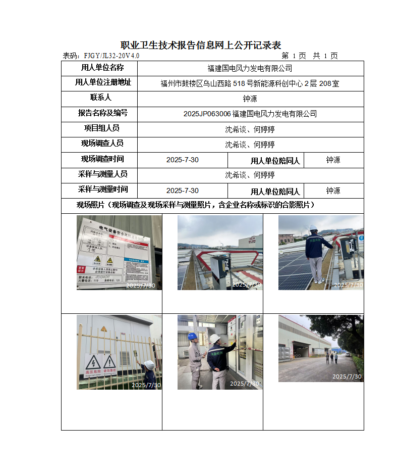 福建国电风力发电有限公司-2025年工作场所职业病危害因素检测