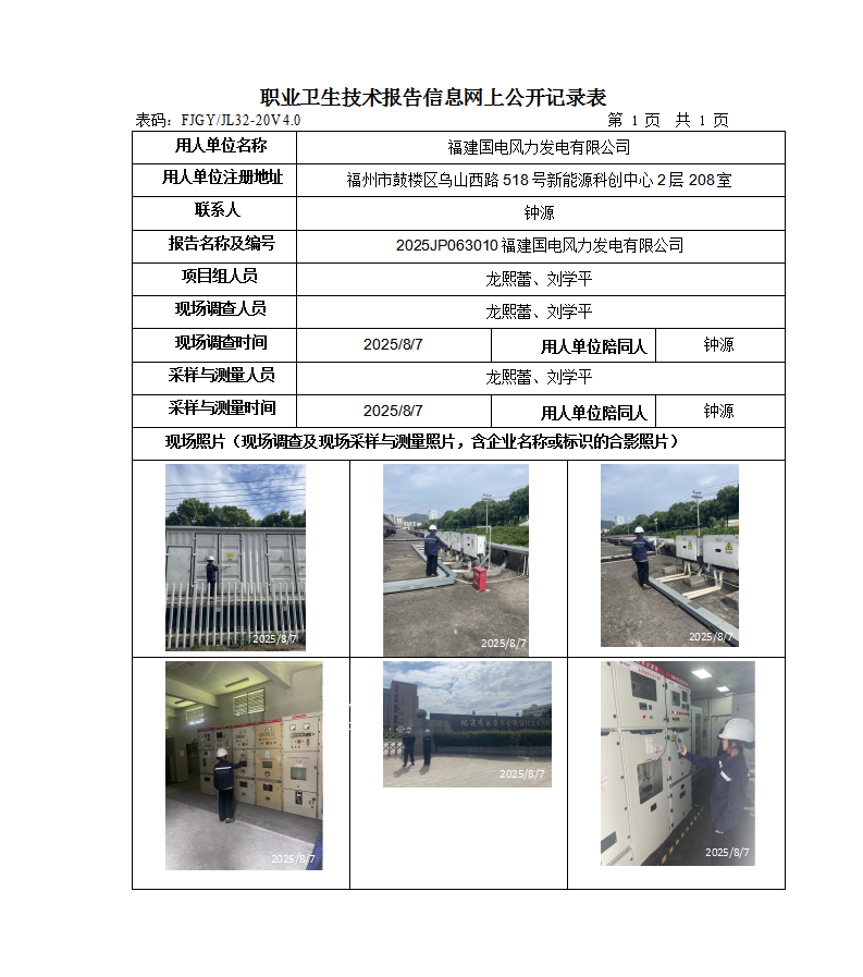 福建国电风力发电有限公司-2025年工作场所职业病危害因素检测