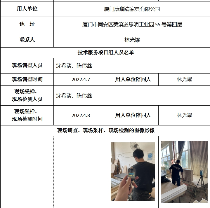 厦门康瑞清家具有限公司2022年工作场所职业病危害因素检测-福建共益安全环保科技